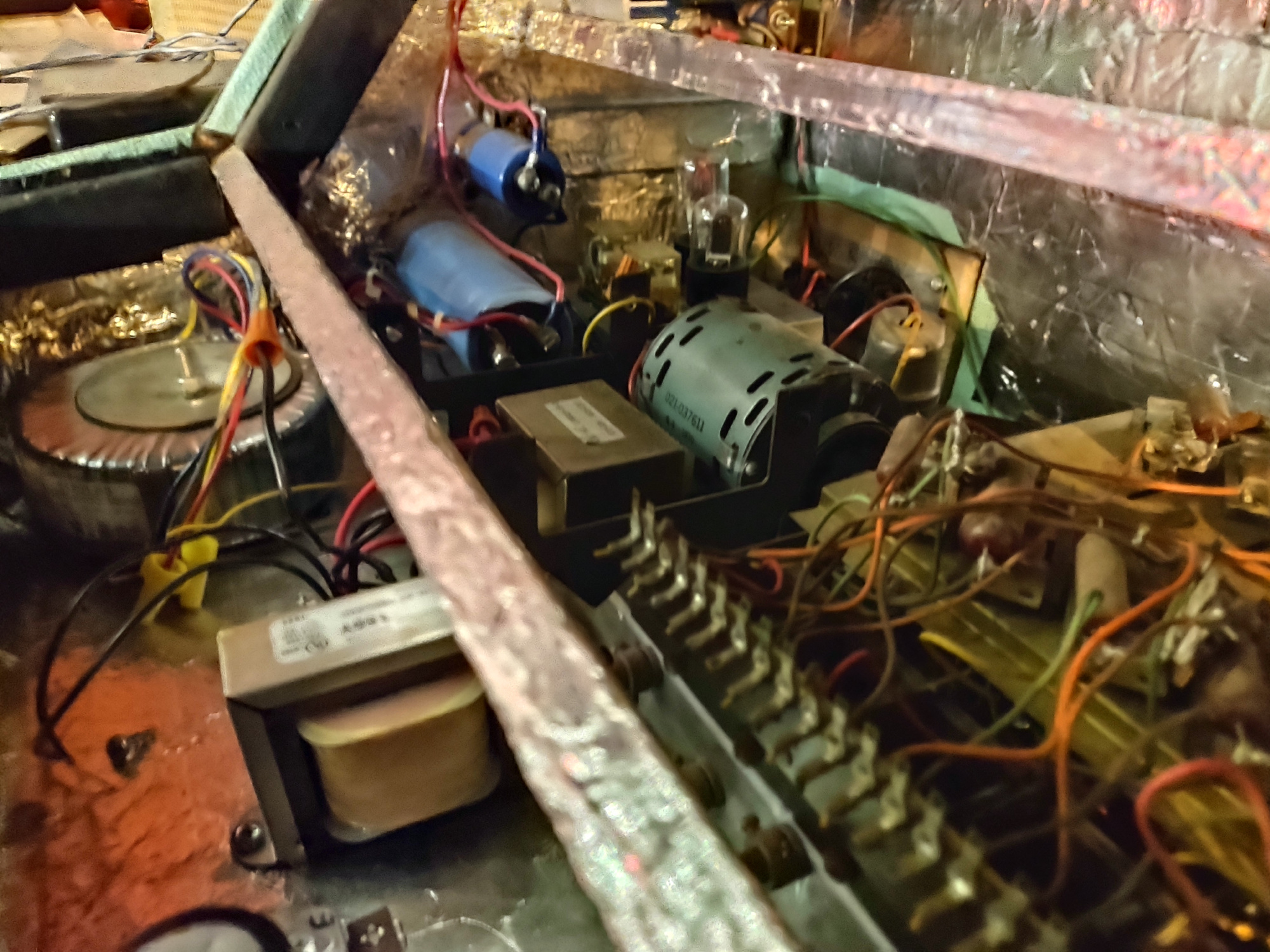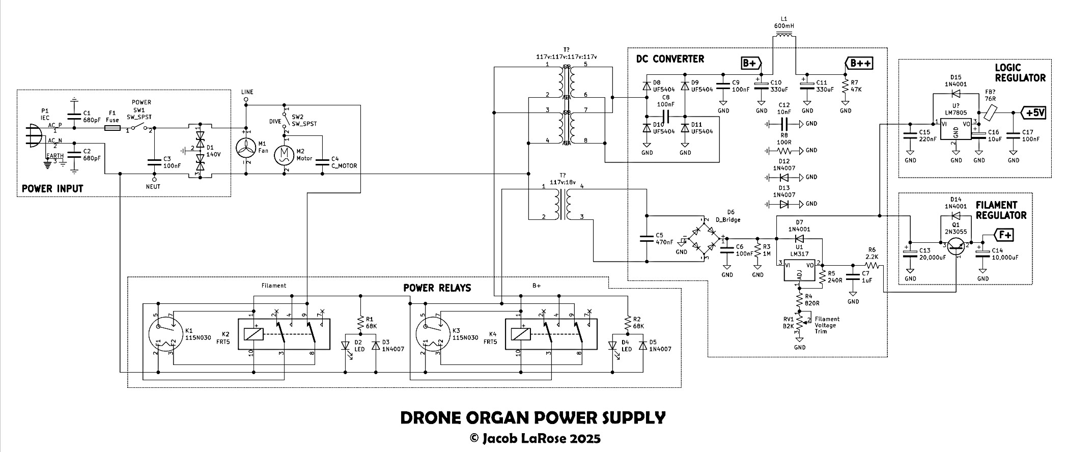 The power supply is controlled by two time-delay relays. When power is first turned on, the tonne wheel motor and the fan spin up. Thirty seconds later, the heater voltage relay turns on. Thirty seconds after that, the main power relay switches on. The reason for this power sequencing is to avoid drawing too much surge current on startup. The heater power circuit utilises an ac-dc converter and a rudimentary voltage regulator to provide a stable, clean power source for the tube heaters.