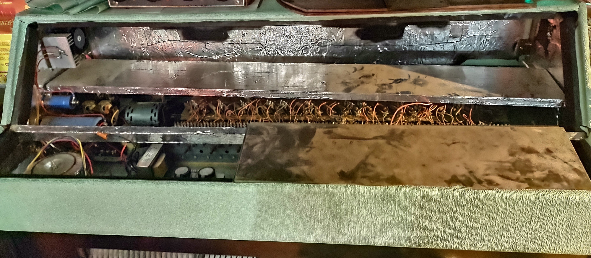 My dad and I were out thrifting one day, and we found a Hammond T-412 for free. We happened to have the trailer with us, so we couldn't resist. The highly-neglected instrument had been sitting outside the thrift shop for some time, it had become the home to a family of mice, and it reeked of cigarette tar. I got it cleaned up best I could and it actually still worked! All the electronics amazingly were fine. I did re-cap the power supply. The T series still uses the tone wheel generator, but with solid state electronics. Fast forward a little bit, and the time the organ spent in the sun caught up to it. The part of the keys where they mount to the metal contact lever became brittle and the keys began to fall off. It wasn't really feasible to repair (or replace) the key bed, so I decided to disassemble and part out the organ. I made standalone units with the built in leslie and drum machine (both of which I have used in some of my recordings). But I was also left to deal with the gargantuan mechanical heart of the organ, the tone wheel generator. That's when I had the idea for the drone organ.